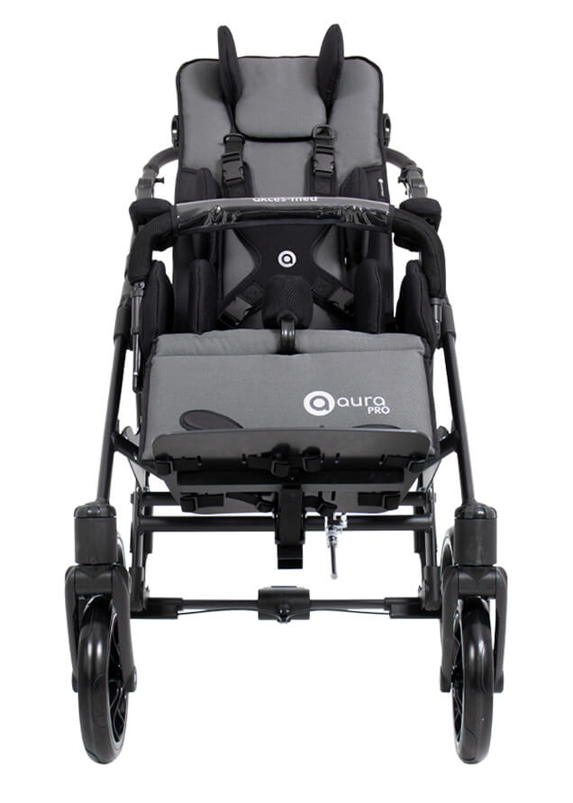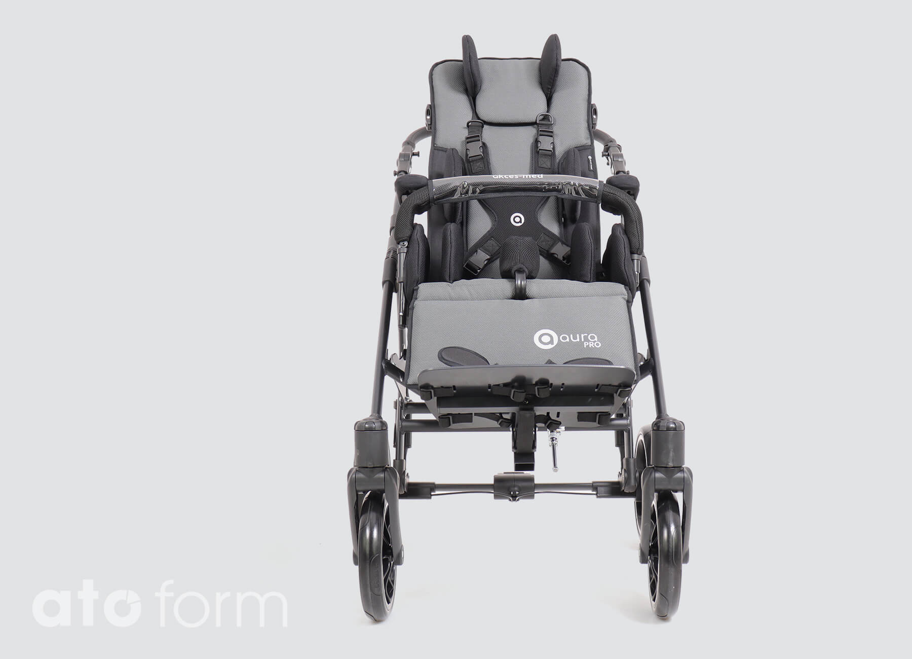 Aura Pro® wächst dank der verstellbaren Rückenlehnenhöhe, Sitztiefe und Fußstützenlänge mit dem Kind mit. Ein fortschrittliches System aus Rumpf- und Hüftpelotten sorgt für eine effektive seitliche Stabilisierung und unterstützt gleichzeitig eine korrekte Körperhaltung.